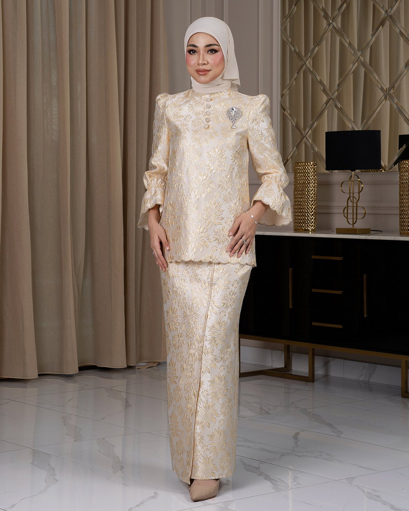 Grace Kurung, this modern kurung is crafted from luxurious brocade fabric, featuring intricate woven patterns that add depth and elegance. Designed with a contemporary silhouette, it blends traditional charm with modern sophistication.